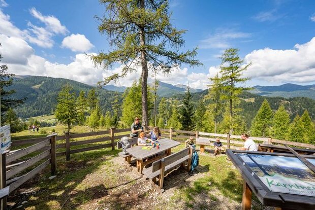 An diesem Punkt auf der Flattnitz liegt ein traumhaftes Bergpanorama vor dir. Zur guten Orientierung fahre die Gipfelkette mit dem Finger nach.